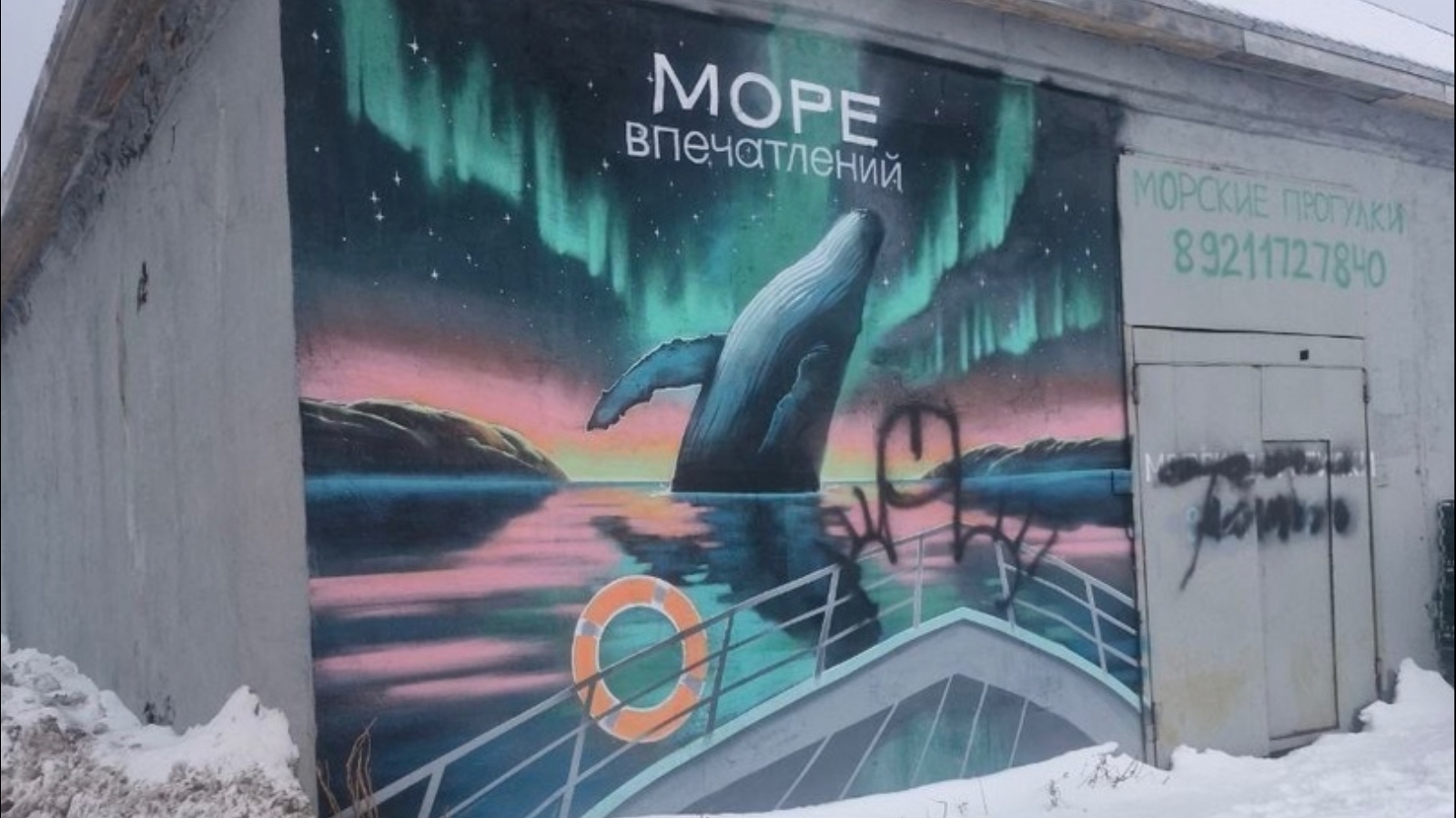 Рисунок, который находится на подстанции по дороге в Лодейное, неподалеку от Териберских судоремонтных мастерских, подвергся нападению вандалов. Кто-то нарисовал краской на стене мужской детородный орган.