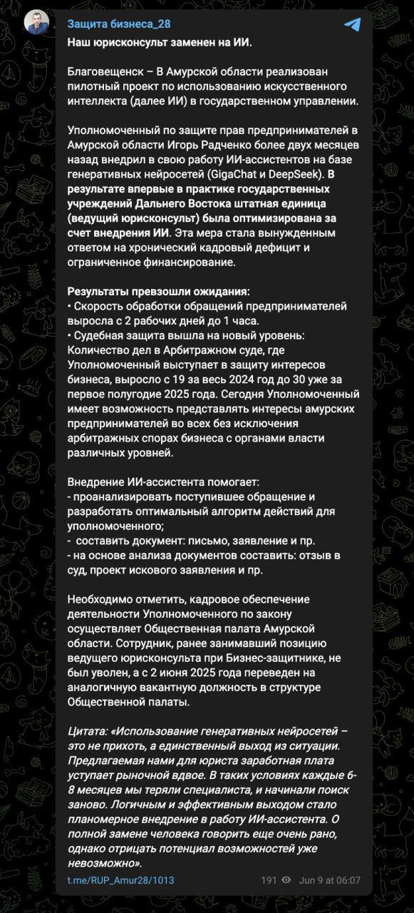 Из-за нехватки бюджета в Благовещенске впервые в России на должность юриста назначили нейросеть.