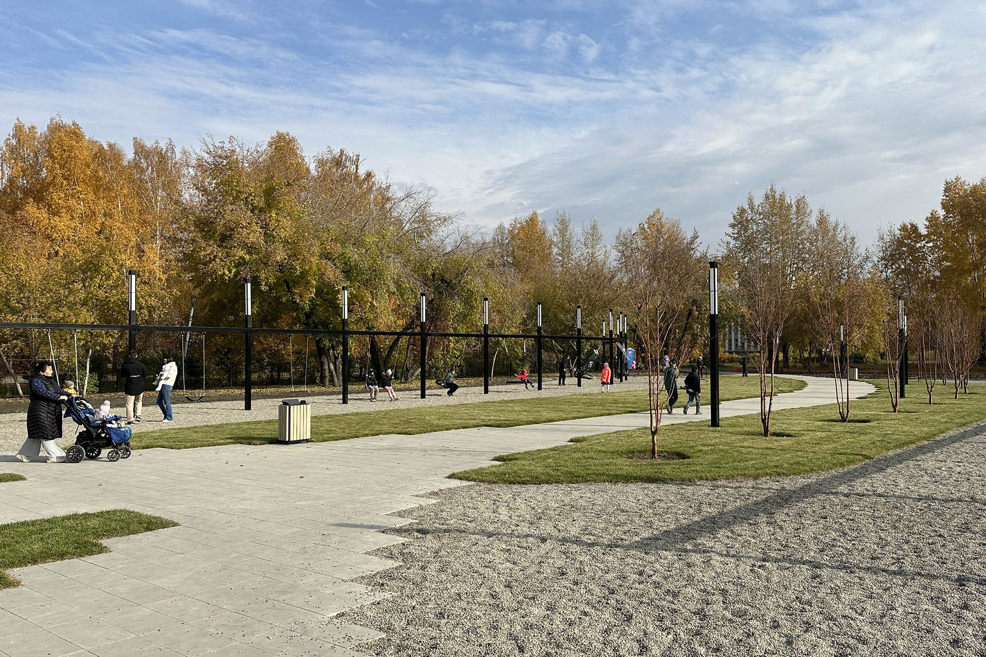 Проект благоустройства разработали в архитектурной мастерской «Лантерна» — на участке появились мощёные дорожки и единая световая конструкция с подвесами-качелями.