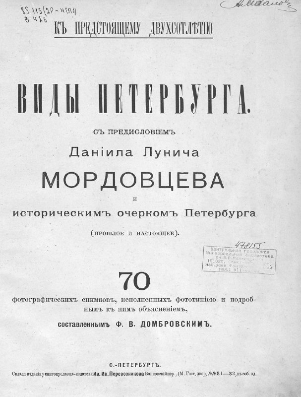 Альбом «Виды Петербурга»В 1901 году к двухсотлетию Санкт-Петербурга был издан альбом, в который вошли 70 фотографий с памятниками, дворцами, монастырями и другими достопримечательностями города. Составитель — историк и этнограф Ф. М. Домбровский.