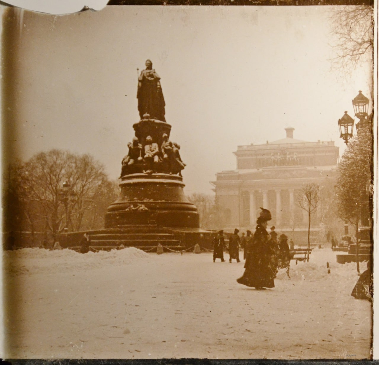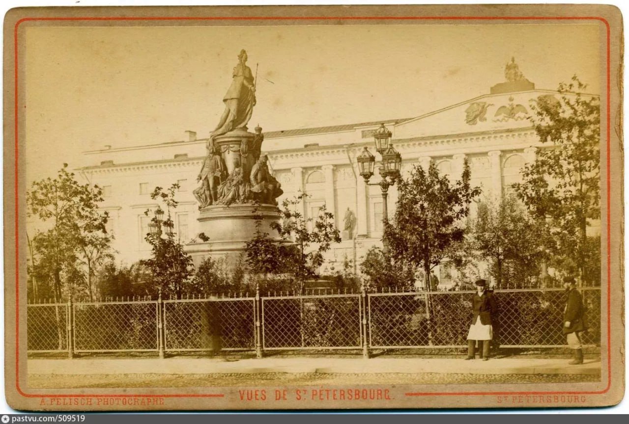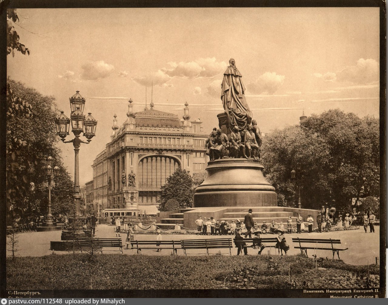 Памятник Екатерине II на старых фотографияхНа все фигуры скульптурной группы было затрачено немногим более 50 тонн бронзы. А для доставки гранитных глыб, из которых изготовлен постамент памятника, потребовалось специальное сооружение железнодорожных путей от невской набережной.