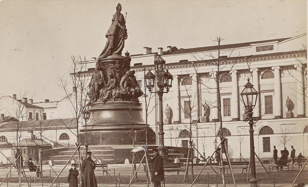 В 1861 году по случаю столетия восшествия на престол Екатерины Великой было принято решение поставить в столице памятник в её честь.Хотя такое решение было принято не сразу. В обществе не утихали дискуссии о том, можно ли ставить такой памятник, ведь сама императрица ещё при жизни строго запретила это делать. Однако Александр II всё-таки решился на такой шаг. Монумент построил художник Михаил Микешин. Памятник торжественно открыли в 1873 году.