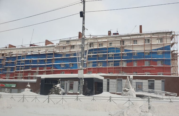 В Салехарде приостановили ремонт фасада дома-флага, который должны были закончить в прошлом году. Фото