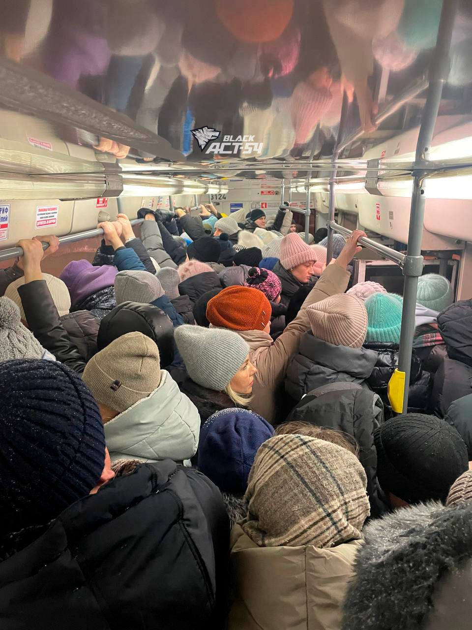 Но не только водители страдают от 11-балльных пробок, что образовались в городе. Пассажиры, которым всё же удалось зайти в общественный транспорт, вынуждены впритык стоять друг к другу.