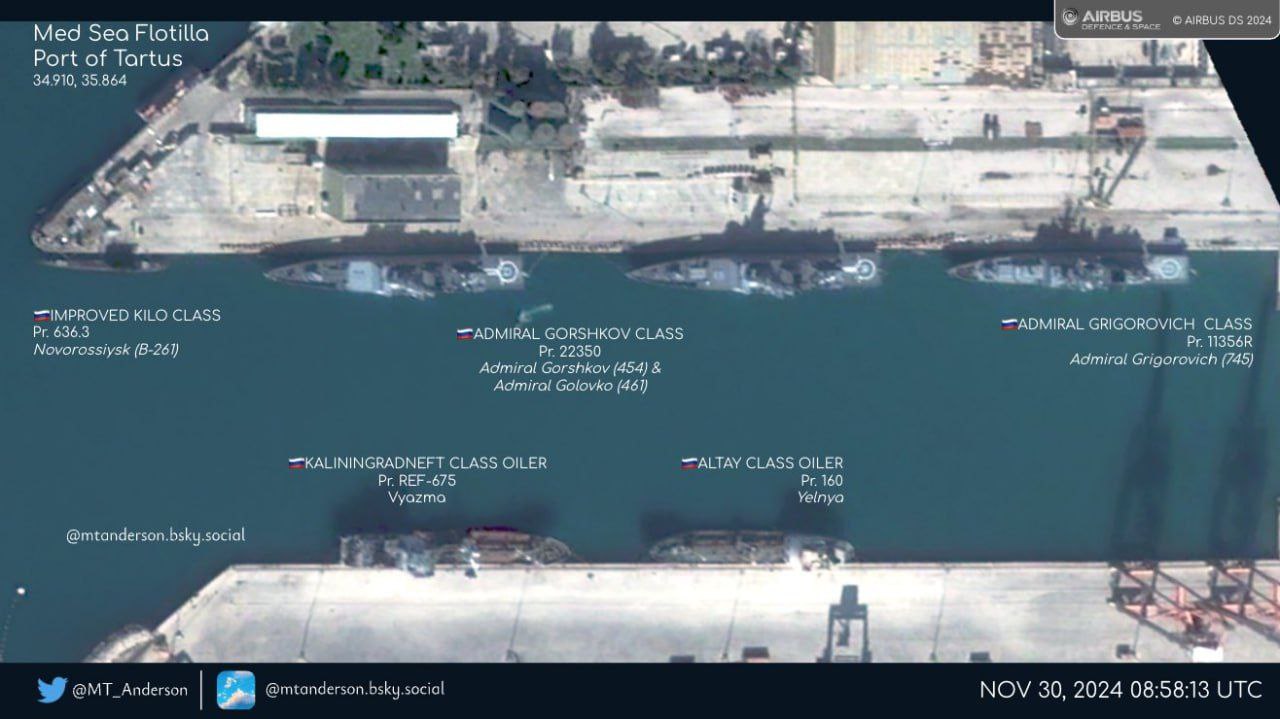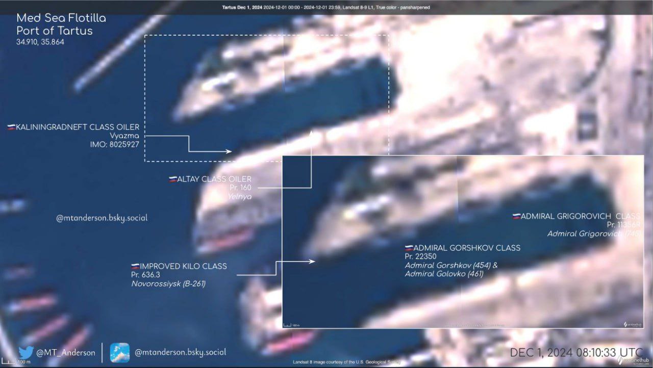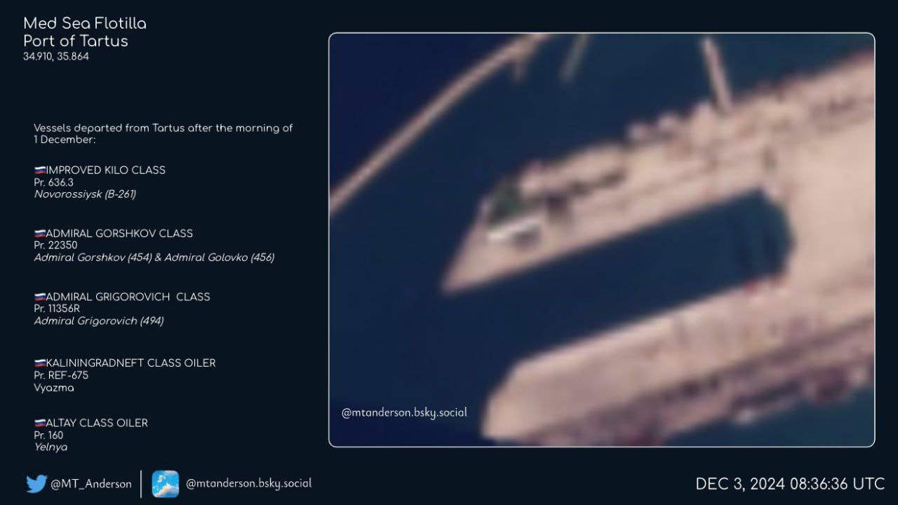 Сообщается, что российскую базу ВМФ в Тартусе покинули по меньшей мере пять кораблей: два многоцелевых фрегата — «Адмирал Горшков» и «Адмирал Головко», сторожевой корабль «Адмирал Григорович», морской танкер «Вязьма» и средний морской танкер «Ельня».