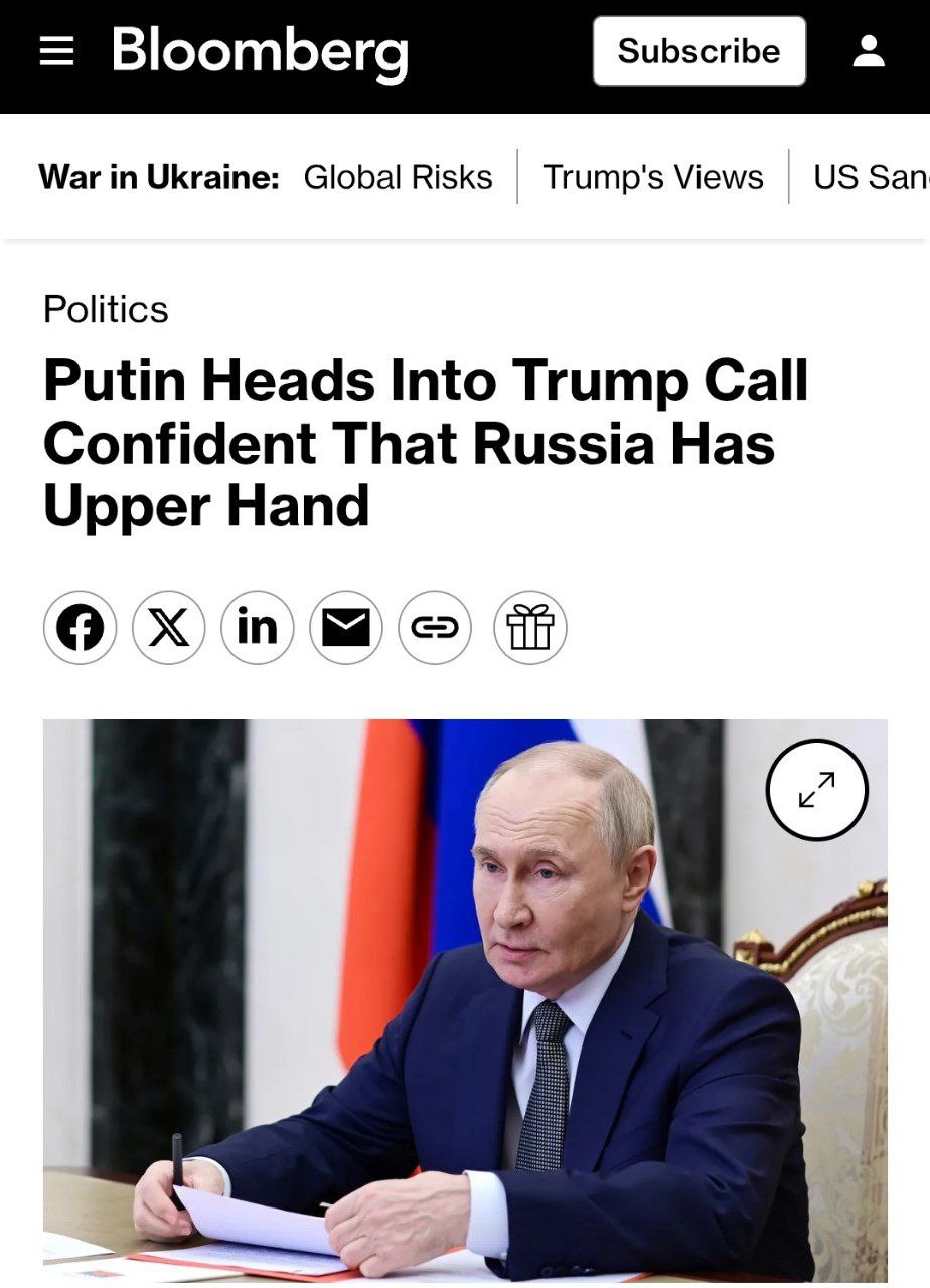 Bloomberg: Владимир Путин выходит на диалог с Трампом, будучи уверенным, что у России есть преимущество.