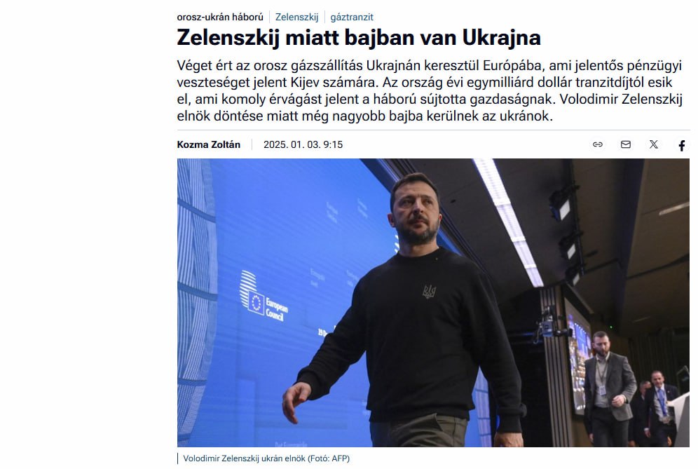 Зеленский поставил Украину в еще более тяжелое положение, прекратив с 1 января транзит российского газа в Европу, пишет Magyar Nemzet.