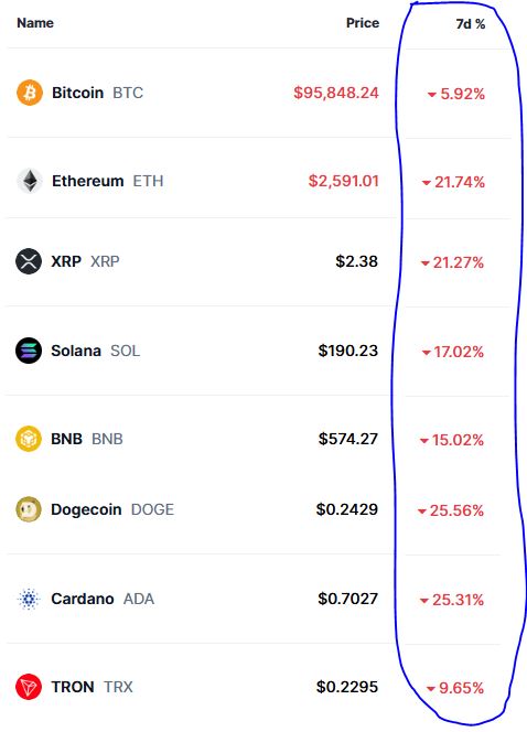 А вот крипта нет. Сами посмотрите на динамику основных монет за последние 7 дней (см. внизу). Упали же из-за пошлин, но почему-то назад не вернулись. А вообще, какое отношение имеют пошлины к крипте? Никакого, но крипта взяла и упала! А как же так? Ранее уже писал о своих подозрениях на этот счет... @marketdumki