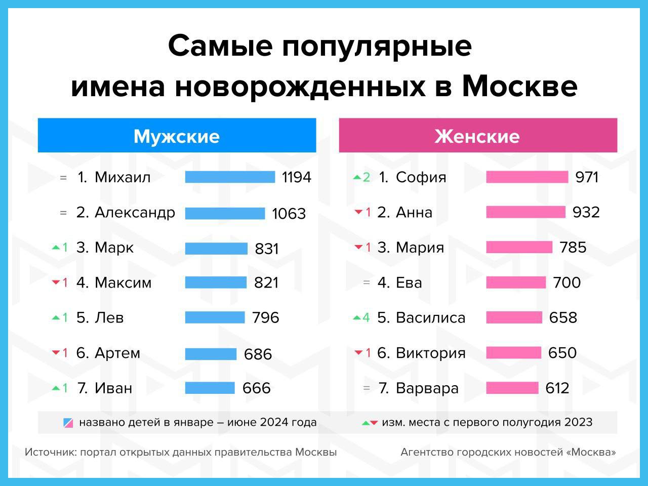 Агентство «Москва» показывает топ детских имен в Москве с начала года ,у мужских имен стабильность. Как и год назад, первое место занимает Михаил, на втором – Александр. Чуть популярнее за год стало имя Марк – это позволило ему закрепиться на третьей позиции. Также в топе Максим, Лев, Артем и Иван