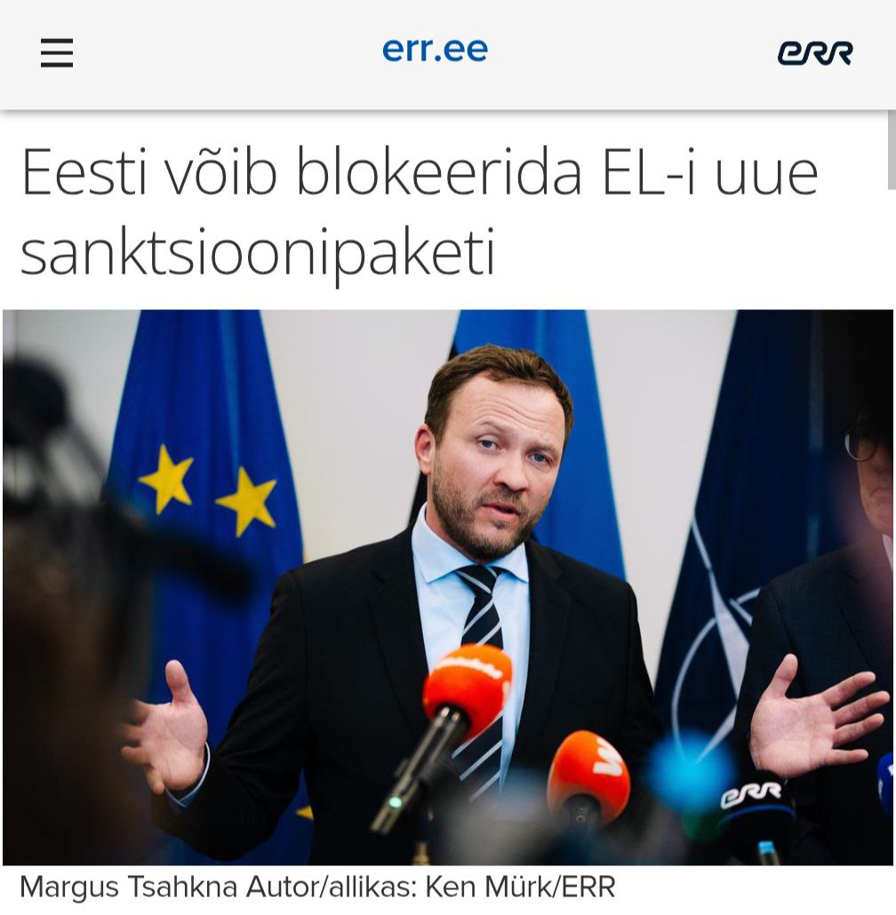 Глава МИД Эстонии Маргус Цахкна заявил, что балтийская республика может заблокировать новый, 18-й пакет санкций против России, если ЕС не пропишет в нём положения о снижении потолка цен на российскую нефть.