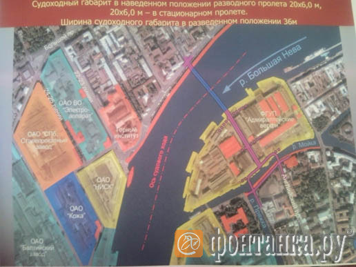 Тогда же лидер петербургского отделения партии «Справедливая Россия» Оксана Дмитриева писала, что в обозначенном месте фарватер делает резкий поворот, а длина разводного пролета моста — 30 метров, и «вписаться» в проход будет затруднительно, что увеличивает вероятность столкновения для нефтеналивных танкеров. Проектировщики же указывали, что именно в створе 22–23-линий появляется «необходимость излома трассы в русле реки для пересечения судового хода под углом 90 градусов».