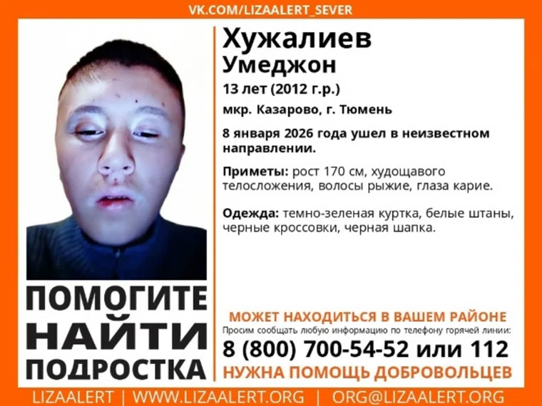 «Хужалиев Умеджон, 13 лет (2012 г.р.), микрорайон Казарово, Тюмень. 8 января ушел в неизвестном направлении. Приметы: рост 170 см, худощавого телосложения, волосы рыжие, глаза карие», — указано в ориентировке, размещенной поисковиками в соцсетях.