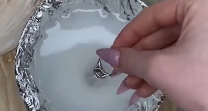 Далее положите туда серебряные драгоценности и хорошо потрясите. Для этого достаточно буквально одной минуты. После следует достать украшения и промыть их под проточной водой.
