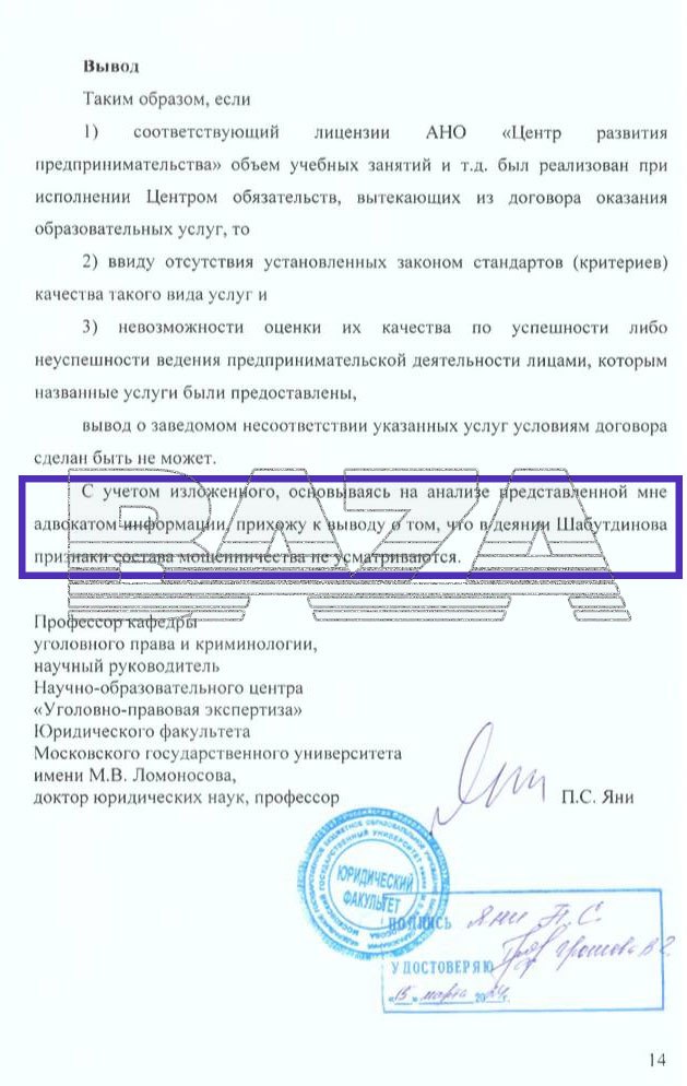 Заключение по просьбе защиты Шабутдинова готовил Павел Яни — доктор юридических наук и профессор кафедры уголовного права. Перед ним поставили один вопрос — образуют ли действия Шабутдинова состав мошенничества? По мнению эксперта, Шабутдинов ни в чём не виноват. Как считает следствие, компания Шабутдинова (АНО «Центр развития предпринимательства») убеждала людей, что они начнут зарабатывать миллионы, пройдя курсы для предпринимателей. По мнению эксперта, этот вывод неправильный — мол, люди не могли рассчитывать на то, что какие-либо приобретенные навыки или умения гарантируют им прибыль.