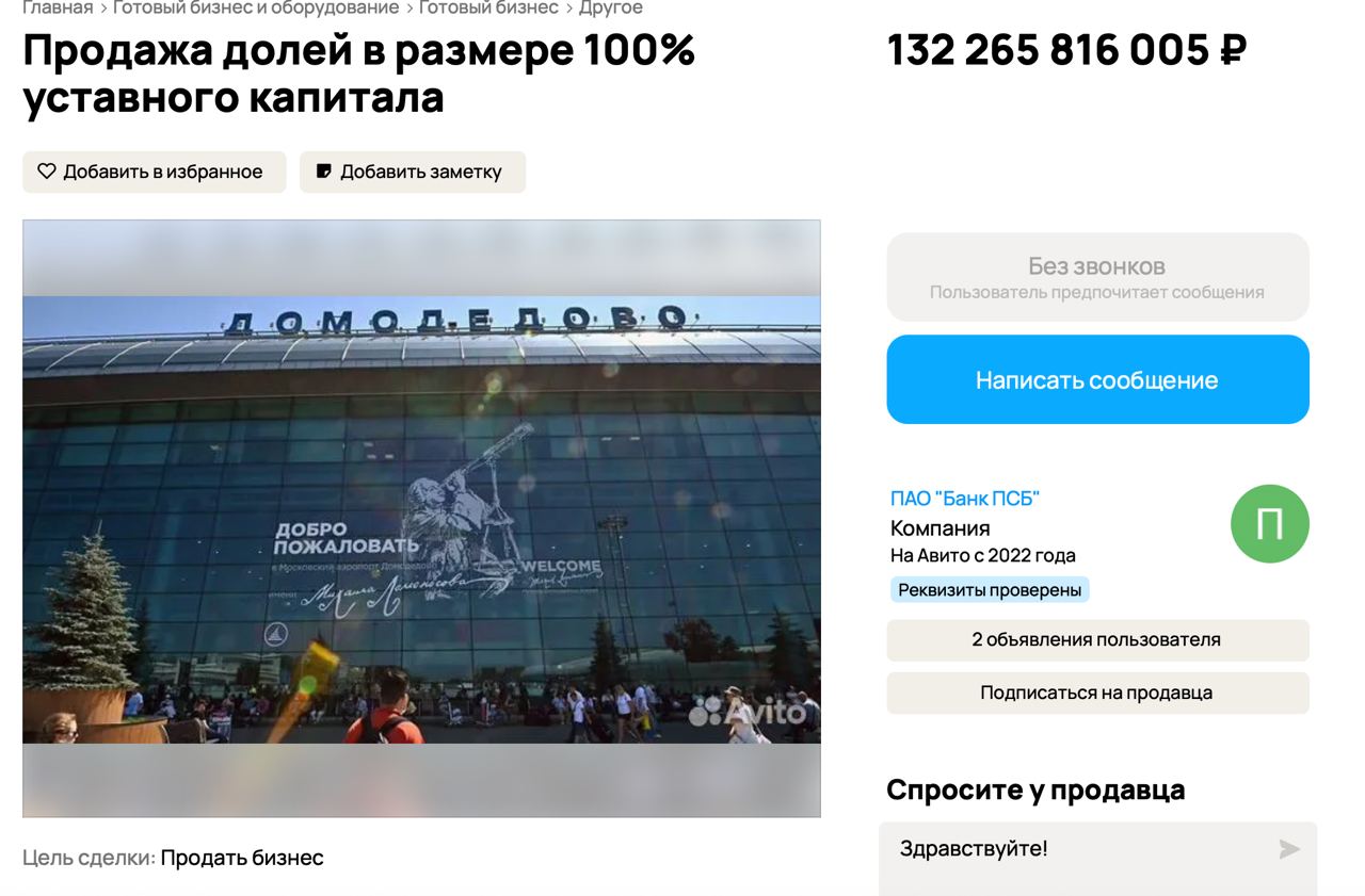 На онлайн-платформе с объявлениями о продаже товаров, услуг и недвижимости «Авито» появилась информация о продаже аэропорта Домодедово.
