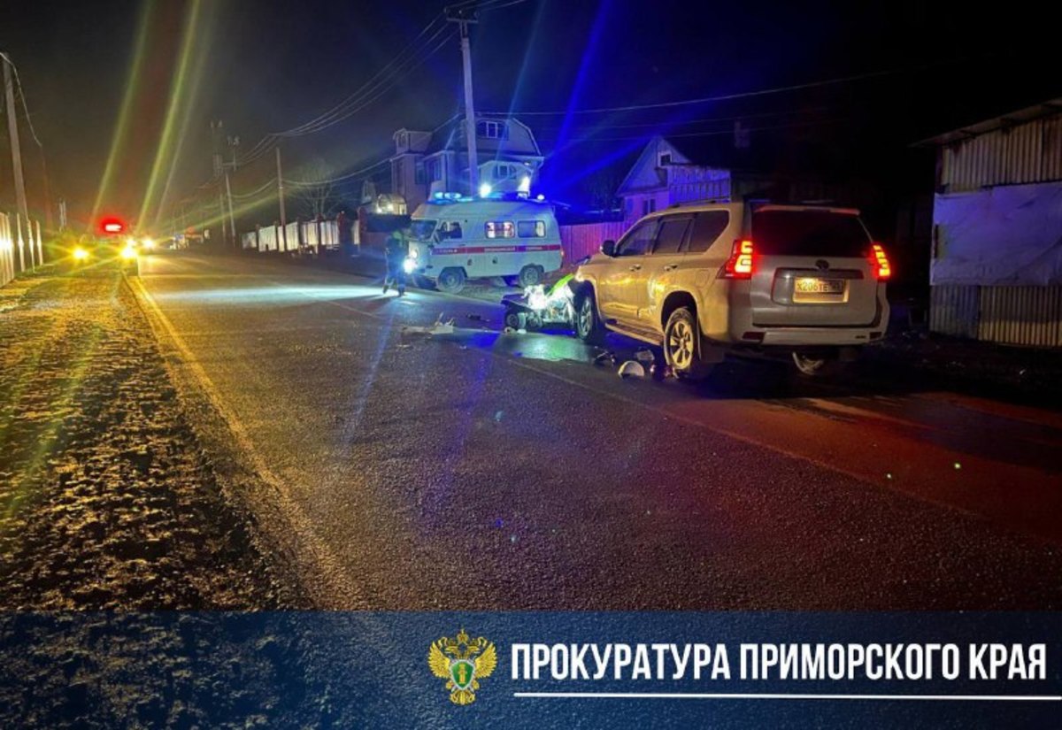 Прокуратура Надеждинского района поставила на контроль ход и результаты доследственной проверки по факту ДТП, в котором погиб мотоциклист. Предварительно установлено, что в вечернее время 29 марта 2025 года в районе дома № 20 по улице Центральная в посёлке Соловей ключ Надеждинской района водитель мотоцикла Honda выехал на полосу встречного движения, где совершил столкновение с автомобилем Toyota Land Cruiser Prado.