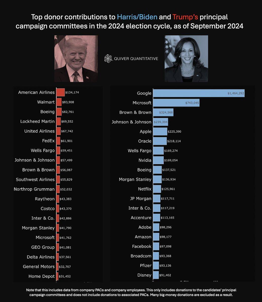 По Сети вот уже месяц гуляет табличка со списком американских компаний-спонсоров Трампа и Харрис. В ней бросается в глаза, что в кандидата от Демпартии США вкладываются в основном IT-компании во главе с Google и Microsoft, тогда как на стороне Большого Дональда — всё сплошь авиация и ВПК.
