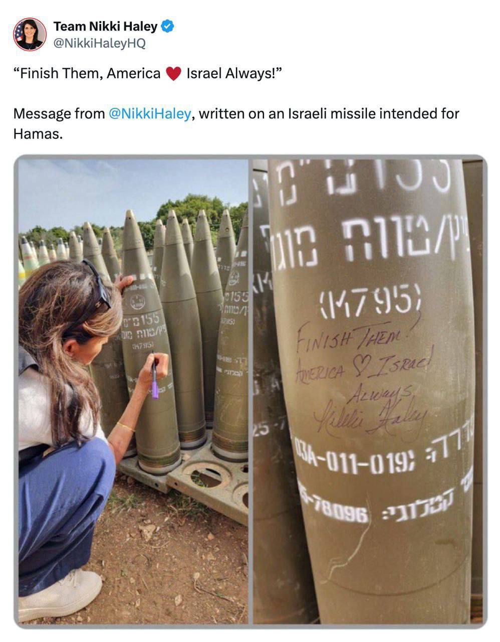 Прикончите их ! Это написала на израильском снаряде, которым бьют по городу Рафах в секторе Газа израильская армия, написала Никки Хейли, бывшая полпред США в ООН и бывшая кандидат в президенты США. Она республиканка, но считается под контролем Глубинного Государства США. То есть такова реальная политика США- убить много палестинских мирных жителей.