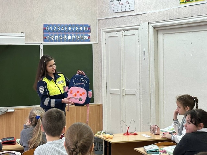 Инспектор Госавтоинспекции рассказала школьникам, как правильно переходить дорогу, о важности использования световозвращающих элементов в условиях недостаточной видимости и в тёмное время суток.