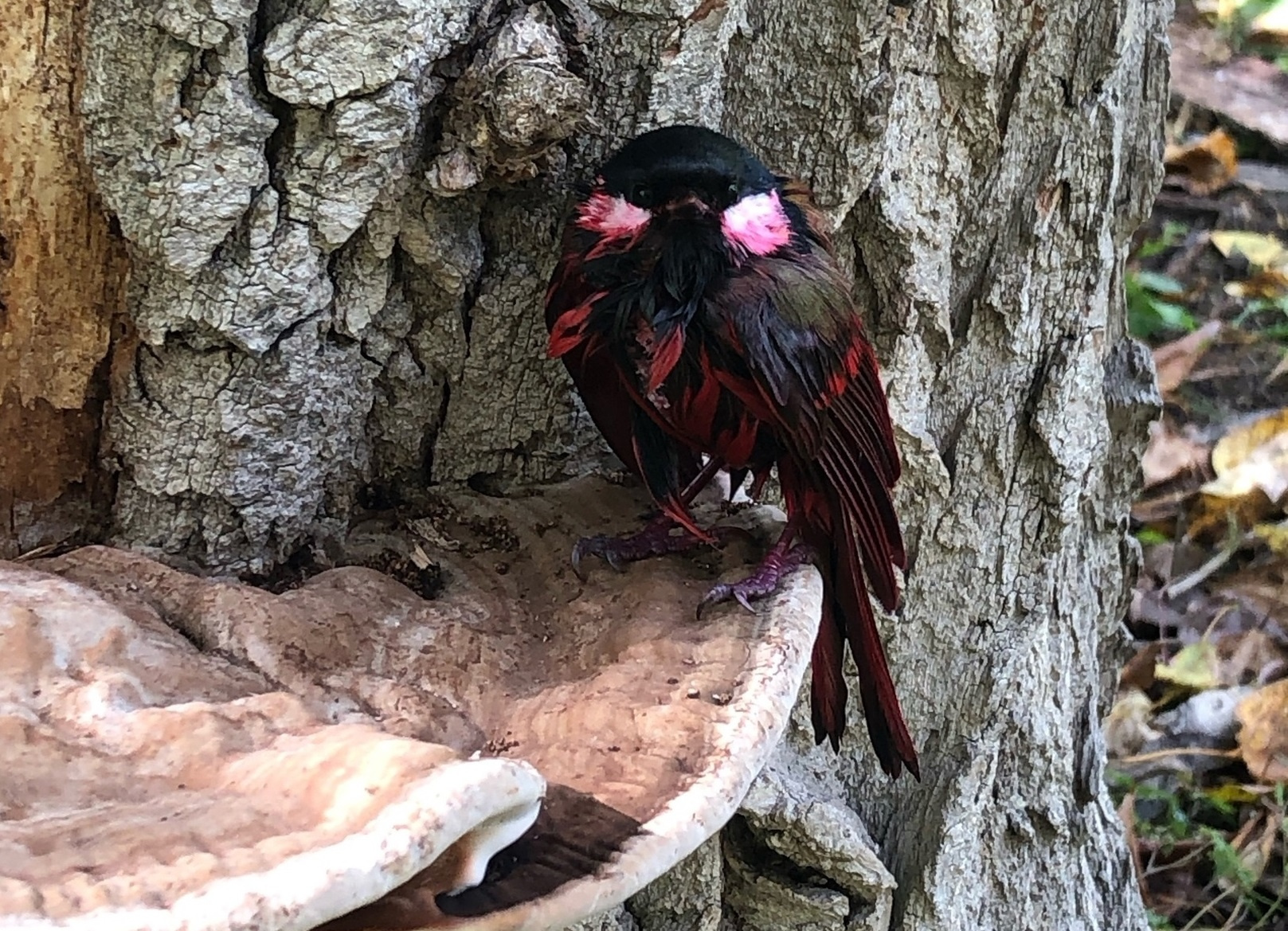 — Да голова со светлыми щеками и взгляд, как у обычной нашей синицы. На спинке такой же, как у нее оливковый цвет. Участки темного оперения стали черными с красным налетом, а белые розовыми. Да это синица, измазанная розовой краской, — пояснил специалист.