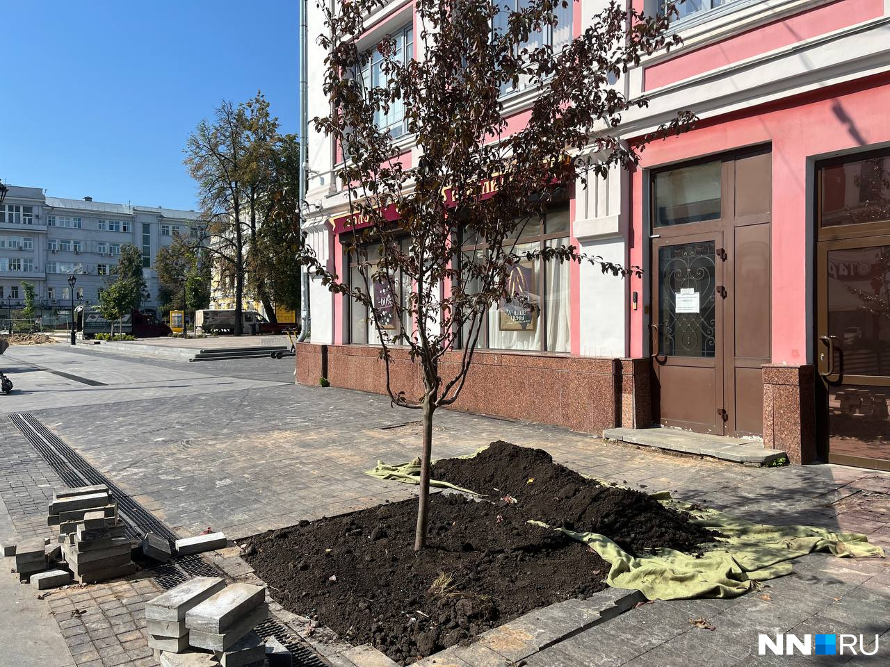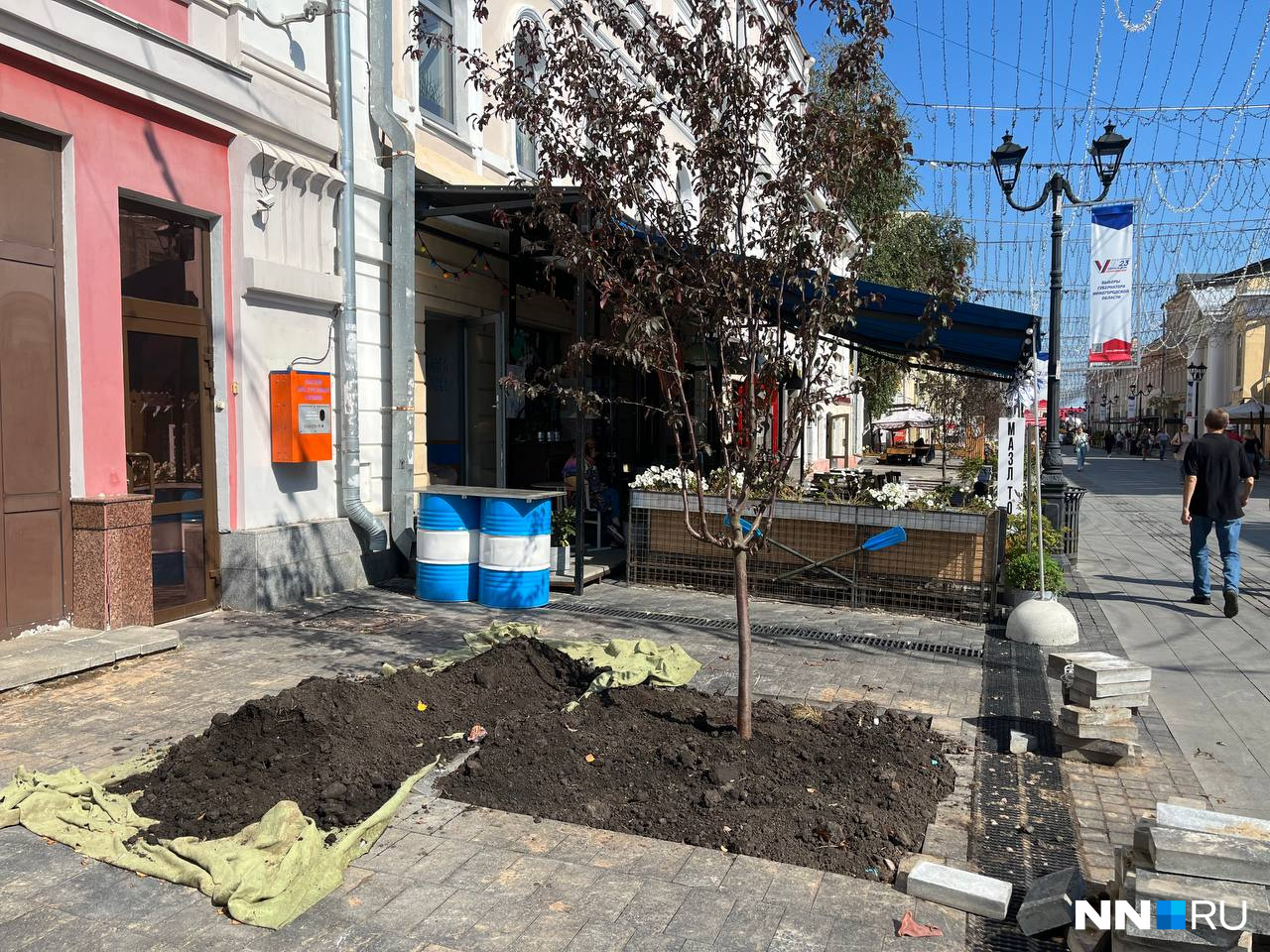 В начале лета с Большой Покровской убрали вазоны, где росли ивы. Как заявил глава Нижегородского района Алексей Рыболовлев, кадки были слишком маленькими для взрослых деревьев: из 36 ив выжили только пять. Тогда власти решили высадить вместо них яблони. Причем не в вазоны или контейнеры в скамейках, а в открытый грунт. Почему улицу решили озеленять яблонями, а не каким-либо другими деревьями, глава района не пояснил.