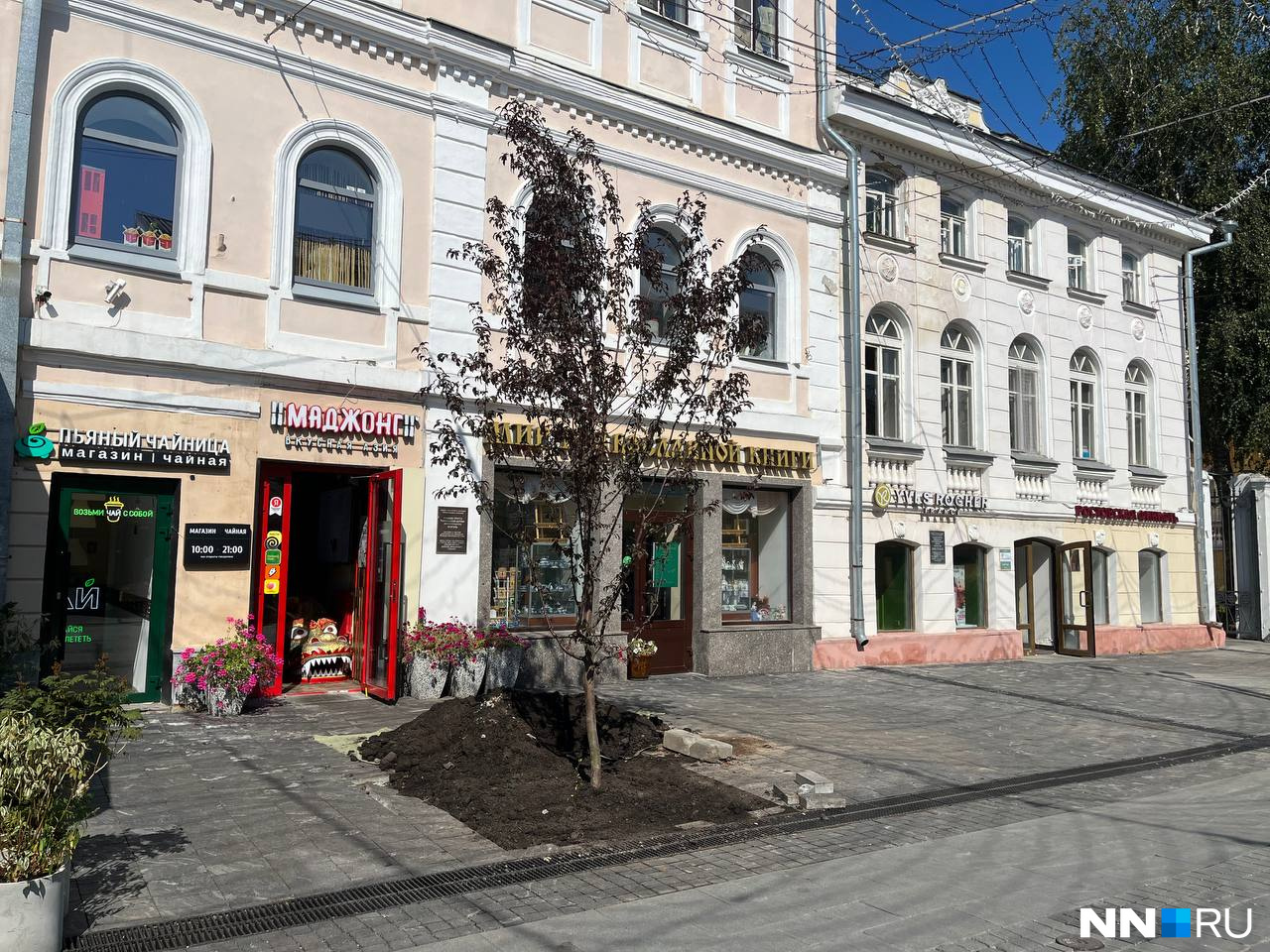 Напомним, раньше Большая Покровская была очень зеленой — там росли липы и другие обычные деревья. Большую часть из них убрали во время ремонта в 2006–2007 годах, так как корни могли повредить подземные коммуникации. С тех пор не прекращались бесконечные попытки вырастить декоративные деревья в кадках и клумбах. Подробнее об этой эпопее мы рассказывали в отдельном материале.