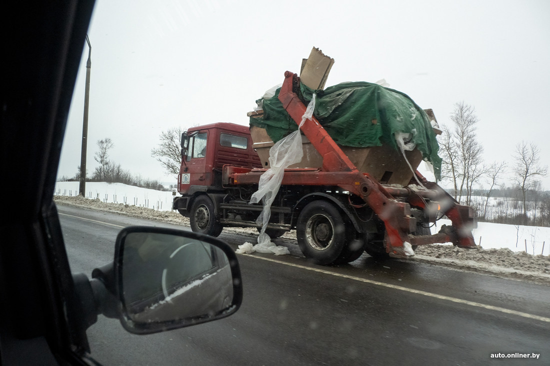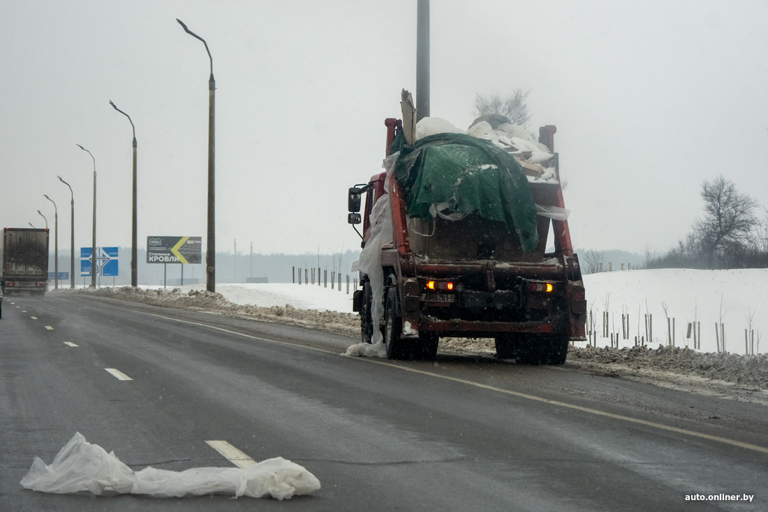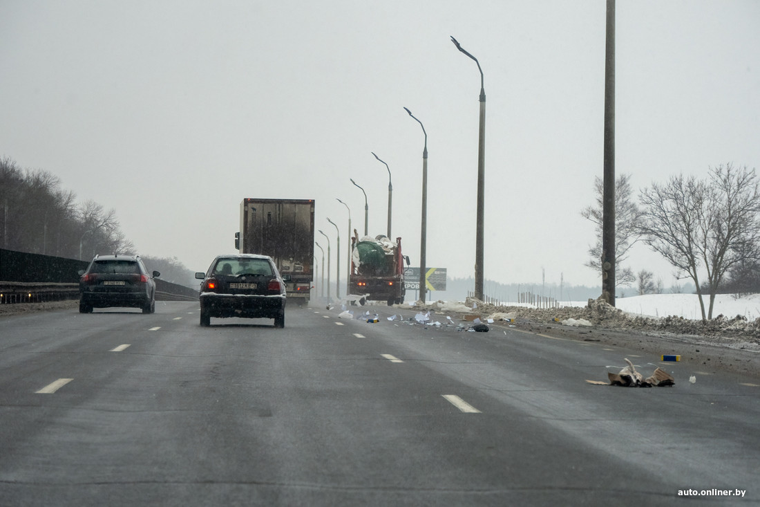 Кстати, мы съездили на могилевскую трассу, чтобы оценить обстановку, и почти в том же месте, где все случилось, словили флешбэк: у проезжавшего мусоровоза потоком воздуха сорвало тент, всякая всячина усеяла правую полосу. Никто не стал тормозить — себе дороже. Но момент показательный: техника вывозит мусор на полигон, в любую секунду может случиться что-то непредвиденное.