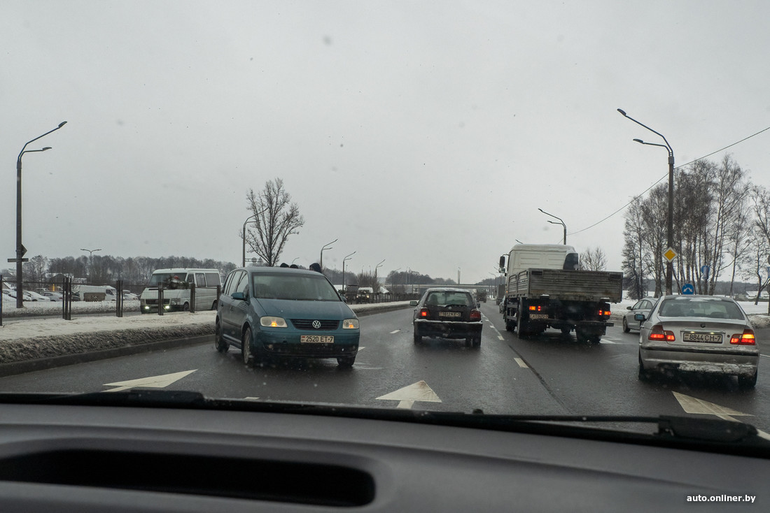 На той же могилевской трассе мы видели последствия недавнего ДТП: одну машину развернуло поперек крайней левой полосы, другая осталась стоять в средней.