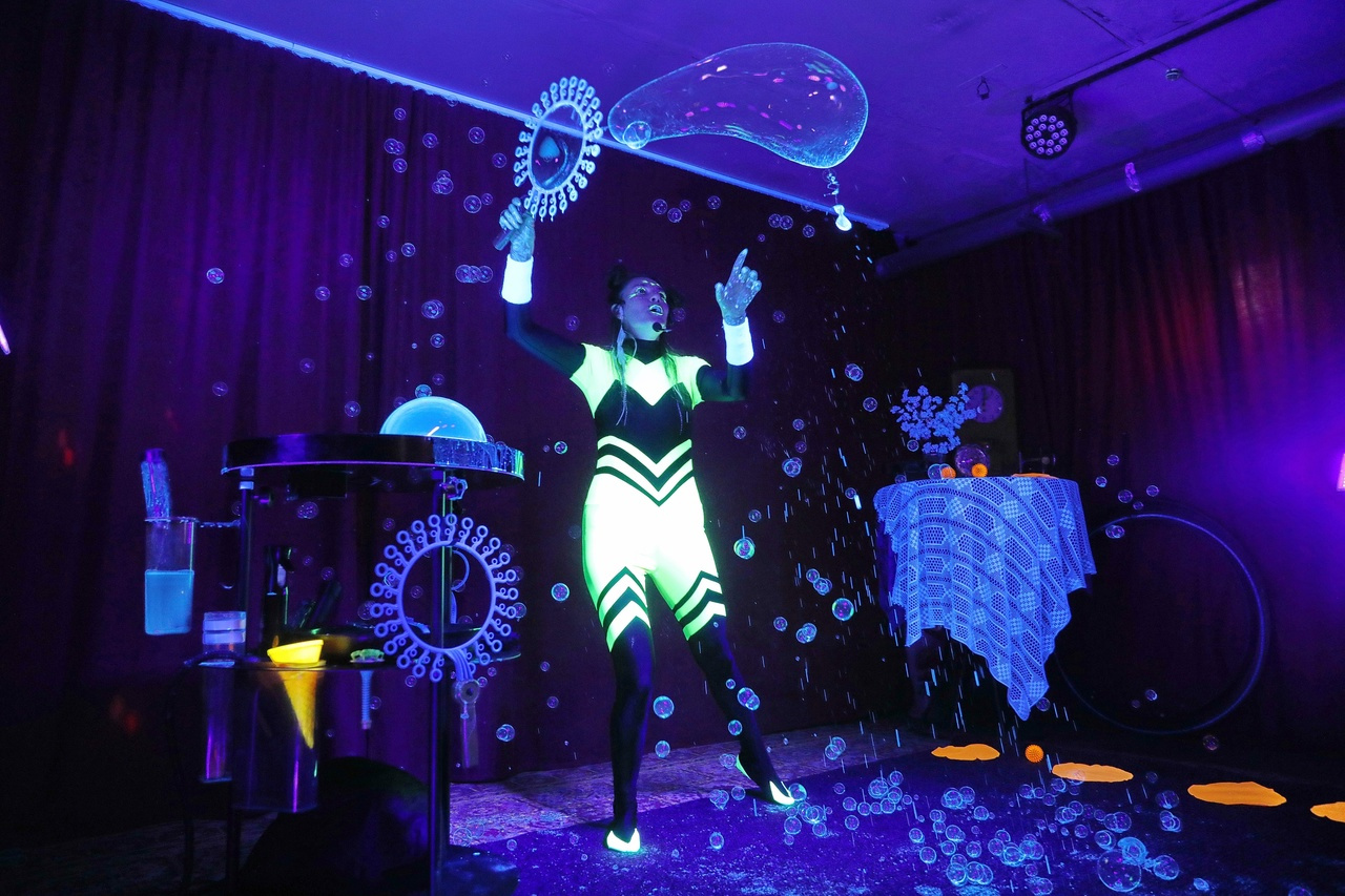Все зрители станут пассажирами космического корабля «Пегас», сразятся с космическими пиратами, окажутся на метеорите с разрядами молний, увидят трюки с огнем и мыльными пузырями. Представление проходит в темноте — пузыри, декорации и костюмы светятся в неоновых прожекторах.