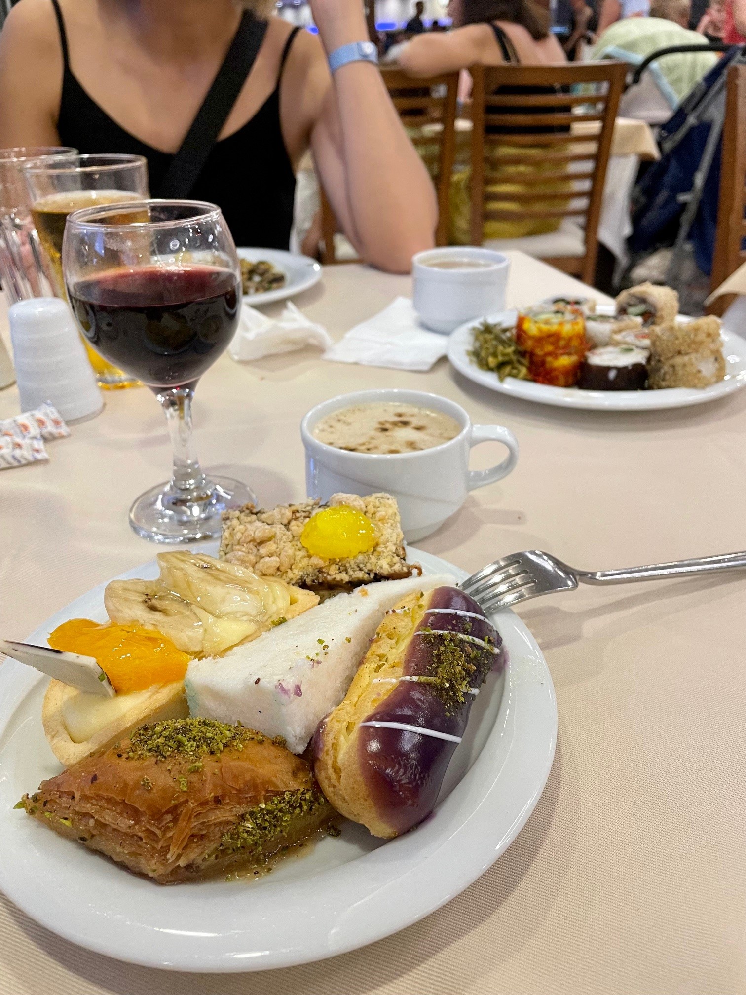 Питание разнообразное, но меню повторяется изо дня в день. Иногда постояльцев радовали тематическими вечеринками: мексиканской, японской и пр. Открыт снек-бар с фастфудом и сладостями. Минус точек общепита — огромные очереди и нехватка столов, особенно за ужином.