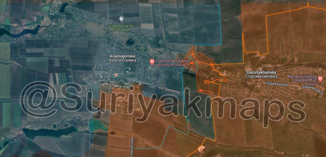 ❗️Пока продолжаются бои в центре города Красногоровка, Армия России продвинулась из Старомихайловки и взяла под контроль участок украинской линии обороны 2014 года, названный «Дом Миныча»