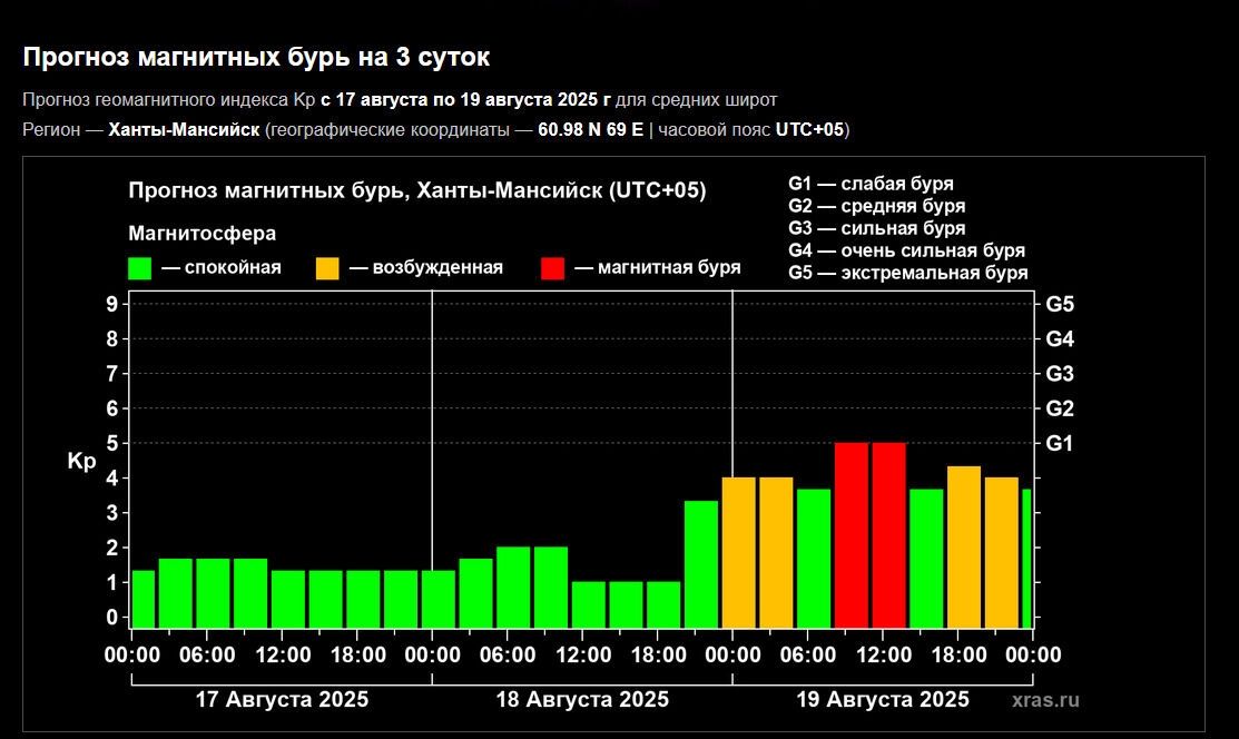 В начале недели обстановка начнет накалятся уже к концу дня 18 августа. Согласно прогнозу Лаборатории солнечной астрономии ИКИ и ИСЗФ, в течение суток магнитосфера будет довольно спокойной и не выйдет за «зеленую» зону. Но ближе полуночи значение Кр повышается почти до 4 баллов. В первые часы 19 августа магнитосфера уже окрашена в оранжевый, что будет свидетельствовать о ее возбужденном состоянии. А днем ударит по ХМАО магнитная буря.