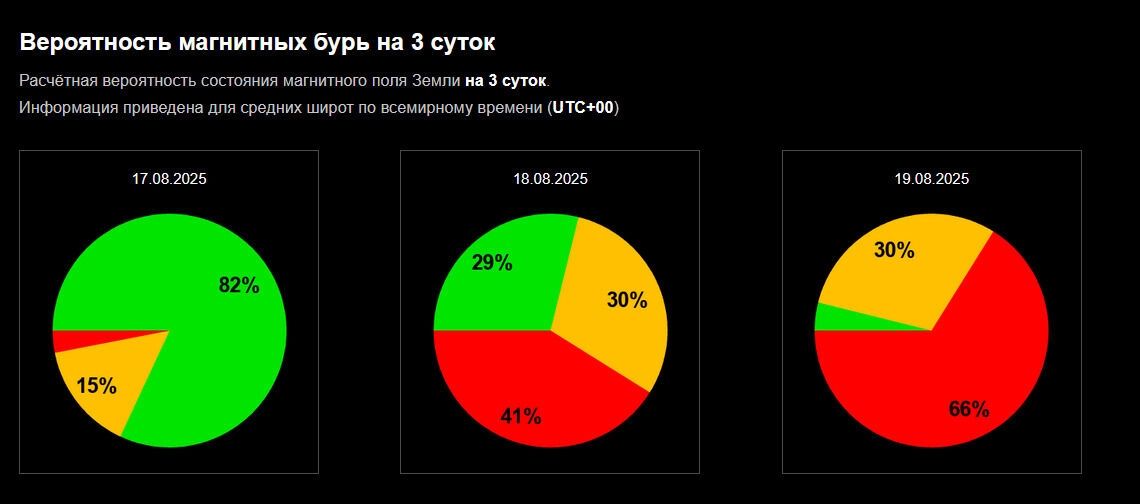 Астрофизики все же считают, что магнитная буря может начаться и раньше. Согласно их расчету, вероятность магнитных бурь в понедельник очень высока — 41%. 30% они дают на то, что магнитосфера будет возбужденной. На то, что магнитной бури и вовсе не будет, ученые ставят всего лишь 29%.