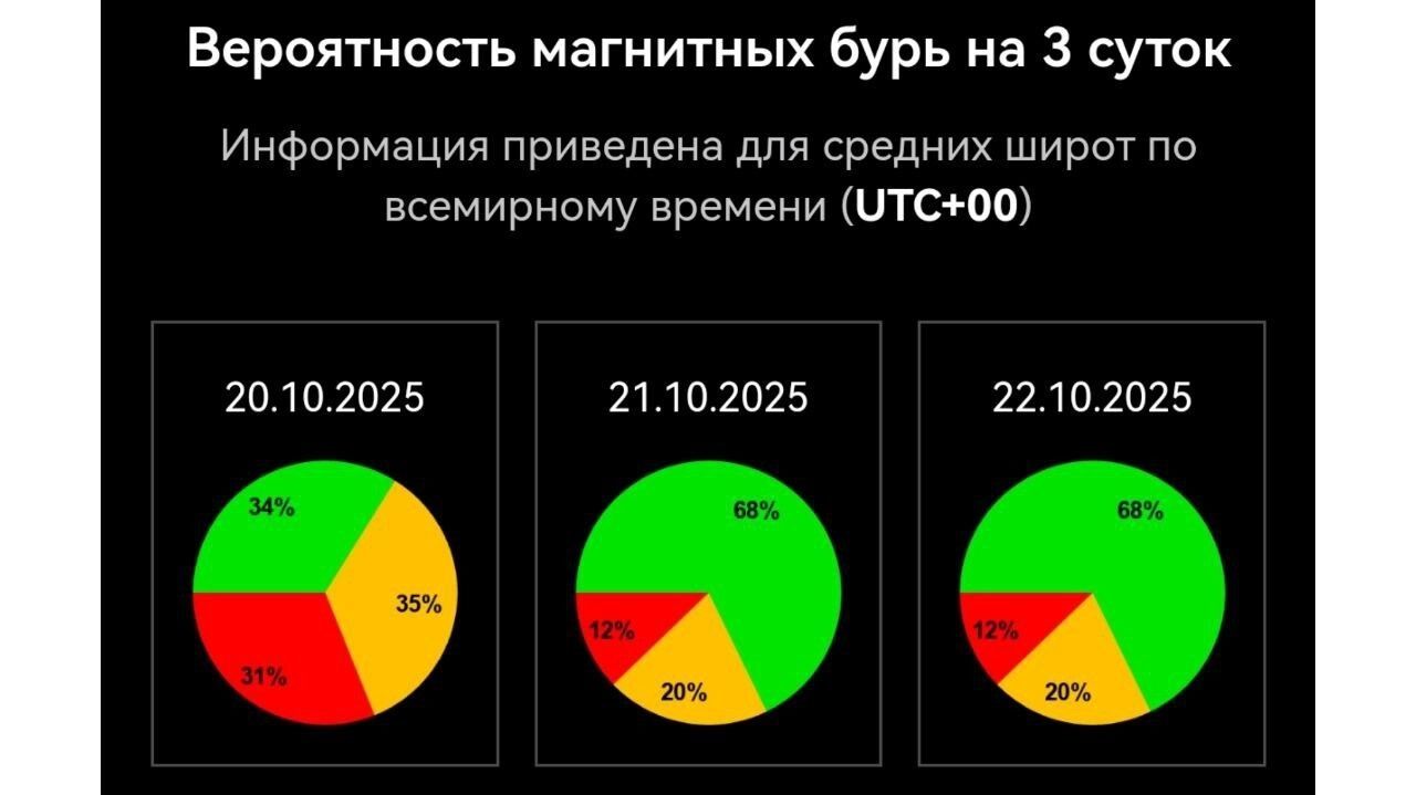 Вероятность магнитной бури 21 октября — 12%, перехода магнитосферы в возбужденную зону — 20%. Как пояснили ученые, последние последствия солнечной активности Земля пережила еще накануне днем. Следующие 5-7 дней ожидается геомагнитное затишье.