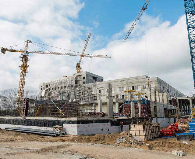 Полностью возведено здание пансионата, сейчас в нем идут работы по чистовой отделке. Центральный блок построен в полном объеме, в нем прокладывают внутренние инженерные сети и монтируют витражные конструкции. Палатный корпус готов на 89%, там устраивают внутренние системы. В ядерном блоке продолжают монтировать индивидуальный тепловой пункт — его готовность оценили на 60%.