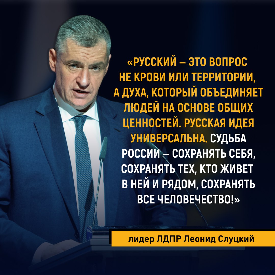 В своей статье по случаю 35-летия первого съезда ЛДПР Леонид Слуцкий заявил, что быть русским — это не про кровь, а про дух. Это общие ценности, которые объединяют нас. Он подчеркнул, что партия готова стать проводником русской культуры и духовности, очистив Россию от чуждого влияния и пересмотрев всю постсоветскую культурную политику.