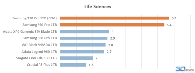 Графики, построенные на основе результатов в различных сценариях, позволяют понять, за счёт чего Samsung 990 Pro совершил такой мощный рывок. Новинка «выстрелила» при двух вариантах нагрузки: при работе с мультимедийным и 3D-контентом и в специализированных приложениях для решения задач из сферы естественных наук.