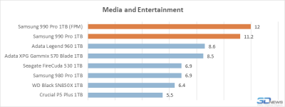 В то же время новый контроллер Pascal явно мощнее прошлого Elpis, и при сложных смешанных нагрузках Samsung 990 Pro действительно выглядит неплохо. Свои способности он наилучшим образом продемонстрировал в профессиональном тесте SPECworkstation, ориентированном на сравнение компонентов для рабочих станций. И этот результат хорошо показывает, кому должна приглянуться новинка Samsung.