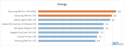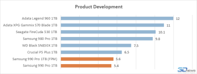 При этом комбинация новых компонентов не всегда даёт однозначно положительный результат. В ряде случаев, например при обычных файловых операциях, Samsung 990 Pro не быстрее своего предшественника, который выигрывает благодаря более широкому параллелизму массива флеш-памяти.