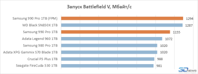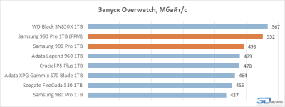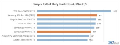 А если посмотреть на составляющие, из которых складывается результат в 3DMark, становится понятно, что звания лучшего SSD для игр Samsung 990 Pro не заслуживает даже с учётом режима Full Performance Mode. Дело в том, что в тех операциях, которые интересуют геймеров в первую очередь, а именно при загрузке игр с накопителя, Samsung 990 Pro уступает WD Black SN850X.