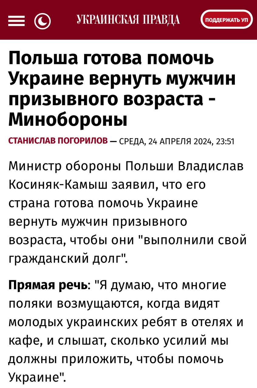 "Польша готова помочь Украине вернуть мужчин призывного возраста", — заявил польский министр обороны.