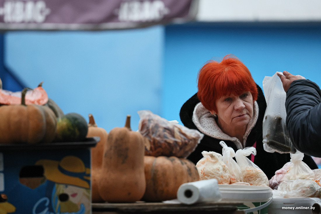 На прилавке тыквы большие и маленькие, целые и нарезанные — неподготовленному человеку в этом разнообразии легко растеряться. Дмитрий же первым делом показывает нам ту, что стоит чуть ближе к продавцу, — она формой напоминает вазу.