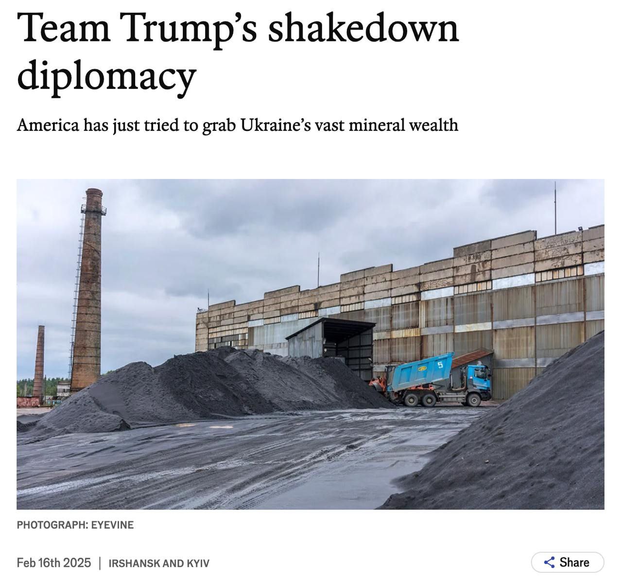 Министр финансов США Скотт Бессант в ходе визита в Киев дал Зеленскому всего час на подписание американского меморандума с требованием "передать США все минеральные богатства страны", сообщает The Economist со ссылкой на источники. При этом украинский президент вообще рассчитывал обсудить продолжение финансовой поддержки. В итоге Зеленский отказался подписывать документ и перенес обсуждение на Мюнхенскую конференцию. Там американцы снова надавили, потребовав от Украины пообещать «500 млрд долларов» природных ресурсов за уже переданную военную помощь. К концу субботы украинская команда договорилась об отсрочке исполнения и согласилась начать процесс переговоров. А Зеленский на пресс-конференции в Мюнхене заявил, что Украина не хочет подписывать документ без гарантий безопасности со стороны США. Ранее о жесткой позиции Бессанта в Киеве сообщало и The Washington Post.