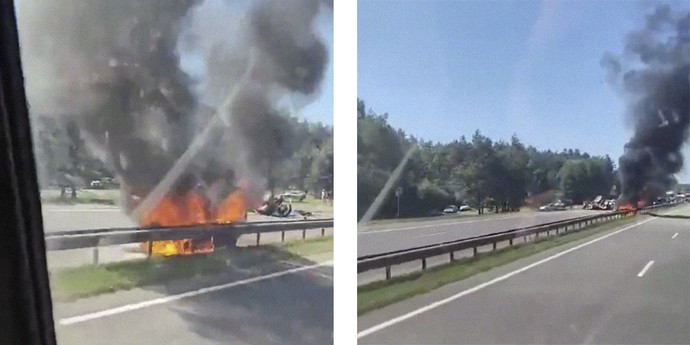 Трактор с прицепом опрокинулся и лежит посреди проезжей части. Легковушка горела возле разделительного ограждения. «Аварию увидела жена, — сообщил читатель, который прислал фото и видео. — Можно увидеть, что у легкового автомобиля выгорел моторный отсек».
