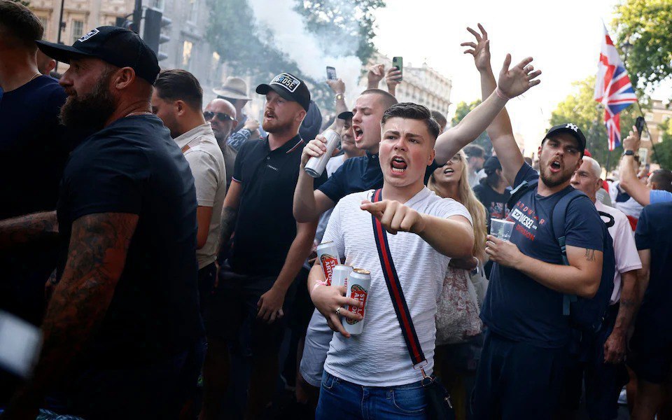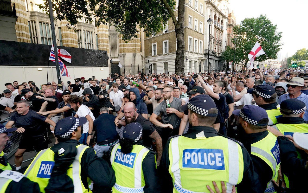 Несколько сотен протестующих собрались недалеко от резиденции премьер-министра Великобритании на Даунинг-стрит в Лондоне после случая с нападением на детей в Саутпорте. После установленного лимита времени на акцию они так и не разошлись.