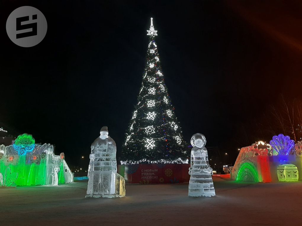 Если погода позволит, лёд будет готов в срок, то на Центральной площади помимо световых и деревянных конструкций возведут ледовый городок. В этом году его тематика — «Зимние узоры»; а посвящён он будет юбилейной дате — 265-летию Ижевска. В ледовых объектах будут и лось, и завод, и монумент «Дружбы народов», и двуглавый орёл, и река Иж, и символика национальных костюмов Удмуртии. Также будут фигуры Деда Мороза и Снегурочка, а также фотозона «Трон».