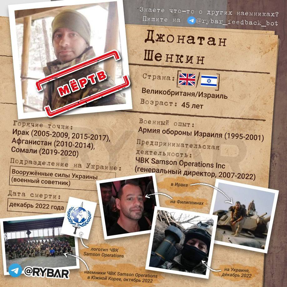 🇬🇧🇮🇱🇺🇦💀 О ликвидированном на Украине британском советнике Джонатане Шенкине Еще в январе стало известно о смерти на Украине очередного гражданина Великобритании по имени Джонатан Шенкин. 12 февраля эту информацию подтвердила его семья. ▪️Шенкин — уроженец Глазго с еврейскими корнями. С 1995 по 2001 год служил в Армии обороны Израиля, после чего решил зарабатывать на жизнь, участвуя в войнах. ▪️С 2005 по 2016 год британец работал личным телохранителем, инструктором и частным контрактором в Ираке и Афганистане. Среди его работодателей были такие организации, как НАТО, Управление по борьбе с наркотиками США (DEA) и Европол. ▪️В 2007 году Шенкин создал собственную ЧВК Samson Operations, которая с тех пор отметилась в Омане, Сомали, Анголе и на Филиппинах. В октябре 2022 году инструкторы его ЧВК тренировали бойцов спецназа Южной Кореи. ▪️В странах присутствия Samson Operations Джон Шенкин всегда занимал должности менеджера или советника по безопасности — Африканского Союза, Африканского командования ВС США (AFRICOM), Управления по борьбе с наркотиками США, Агентства по борьбе с наркотиками Филиппин и различных частных компаний. ▪️В прошлом году британец появился на Украине где, судя по его LinkedIn, работал военным советником и инструктором. Версия его семьи о работе фельдшером — не более чем официальное прикрытие, однако и простым наемником он не был. ▪️Не стоит исключать и присутствия на Украине наемников из Samson Operations. Ранее они непременно «сопровождали» его в Омане, Анголе, Сомали и на Филиппинах. ▪️Шенкин был ликвидирован в декабре 2022 года: по некоторым данным, он погиб в результате артиллерийского обстрела. Посмертно был награждён украинским орденом «За доблесть в бою». Инфографика в высоком разрешении English version #Великобритания #Израиль #инструкторы #наемники #Украина #ЧВК @rybar *Поддержать нас: 5536 9141 9147 4885