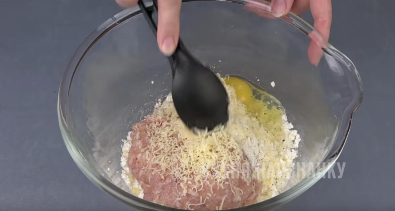 Добавляю к творогу куриный фарш, муку, соль, чёрный перец, сыр и яйцо. Перемешиваю всё хорошенько и отбиваю фарш.