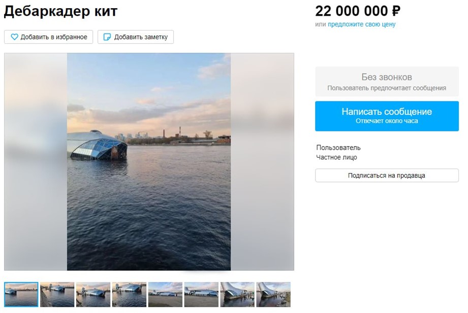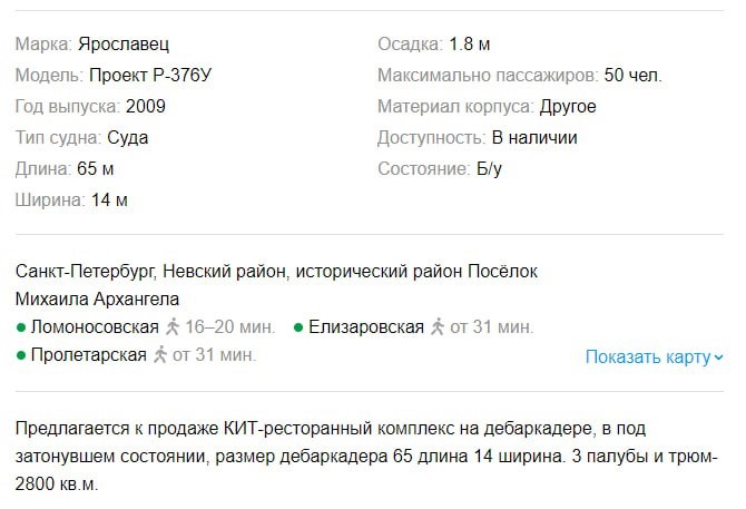 "Предлагается к продаже КИТ-ресторанный комплекс на дебаркадере, в подзатонувшем состоянии", — сообщает владелец.