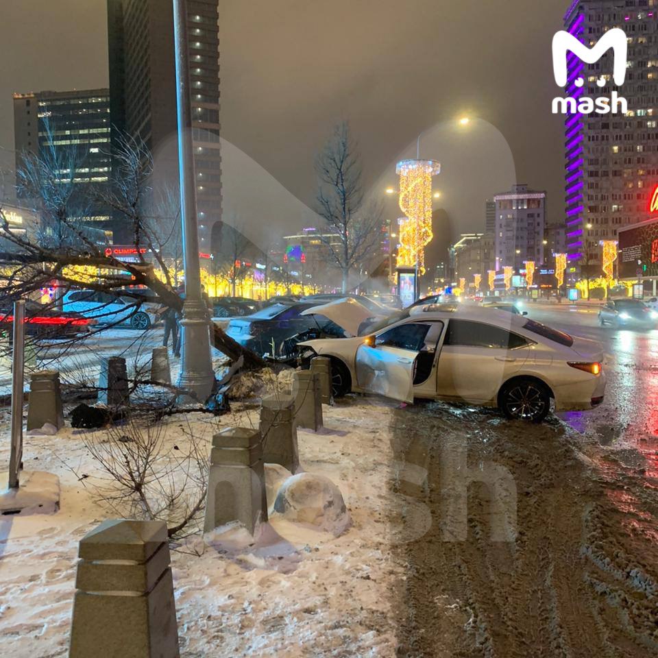 Lexus на большой скорости влетел в дерево на Новом Арбате в Москве. Предварительно, водитель не справился с управлением.